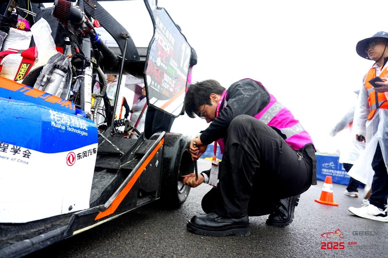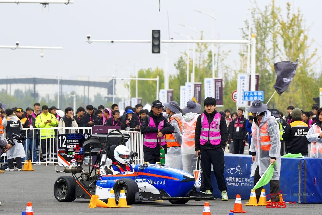 在最具挑战性的动态赛中,北洋动力车队交出了一份亮眼的成绩单:8字环绕5.595秒、直线加速4.99秒、高速避障1分08秒334、耐久赛单圈1分15秒189。特别是在耐力测试中,车队遭遇突发降雨,技术组迅速完成雨胎更换,车手沉着应对复杂赛道条件,展现出过硬的心理素质和技术实力。当赛车冲过终点线时,"巍巍北洋,动力无限"的欢呼声响彻赛场。