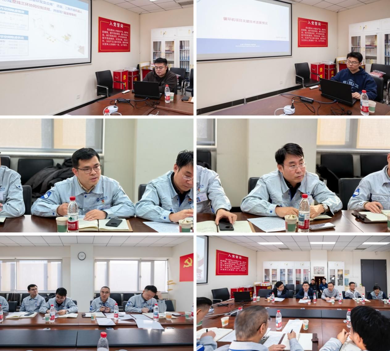 在技术交流环节,天津大学机械学院党支部代表系统介绍了重载机器人及辗环机项目的研发进展。报告围绕关键技术创新、实验验证数据、阶段性成果及下一步计划展开,重点阐释了在结构设计、控制系统、工艺集成等方面的突破,展现了学校在高端装备与智能制造领域的科研积累与技术实力。随后,通用技术天锻公司科技创新党支部的专家代表结合产业实践,从工程化应用、工艺适配、可靠性提升等角度进行了专业点评,双方就推动技术成果向现实生产力转化开展了务实而深入的探讨。