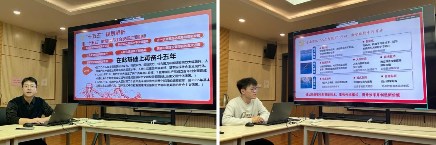 赵旭东在随后的理论学习领学中,结合研究生科研实际,系统阐释了“十五五”规划与习近平总书记回信中关于科技自立自强的重要论述。他详细解读了规划中科技创新的核心要义,指出《建议》全文中“科技”与“创新”分别出现46次和61次,这一高频次凸显出科技创新已被提升至驱动高质量发展的核心引擎地位,是我国应对复杂国际形势、保障中国式现代化行稳致远的战略选择。随后,王永峰围绕《建议》中关于深入推进数字中国建设的专项部署展开介绍,系统阐述了人工智能赋能千行百业的技术基础、核心要素与发展目标,并具体列举了其在教育、医疗、城市治理和产业升级等领域的应用成效。他强调,人工智能正在深刻改变生活方式、重塑研究范式与创新模式,研究生党员应主动适应这一趋势,将其转化为推动科研突破的有力工具。