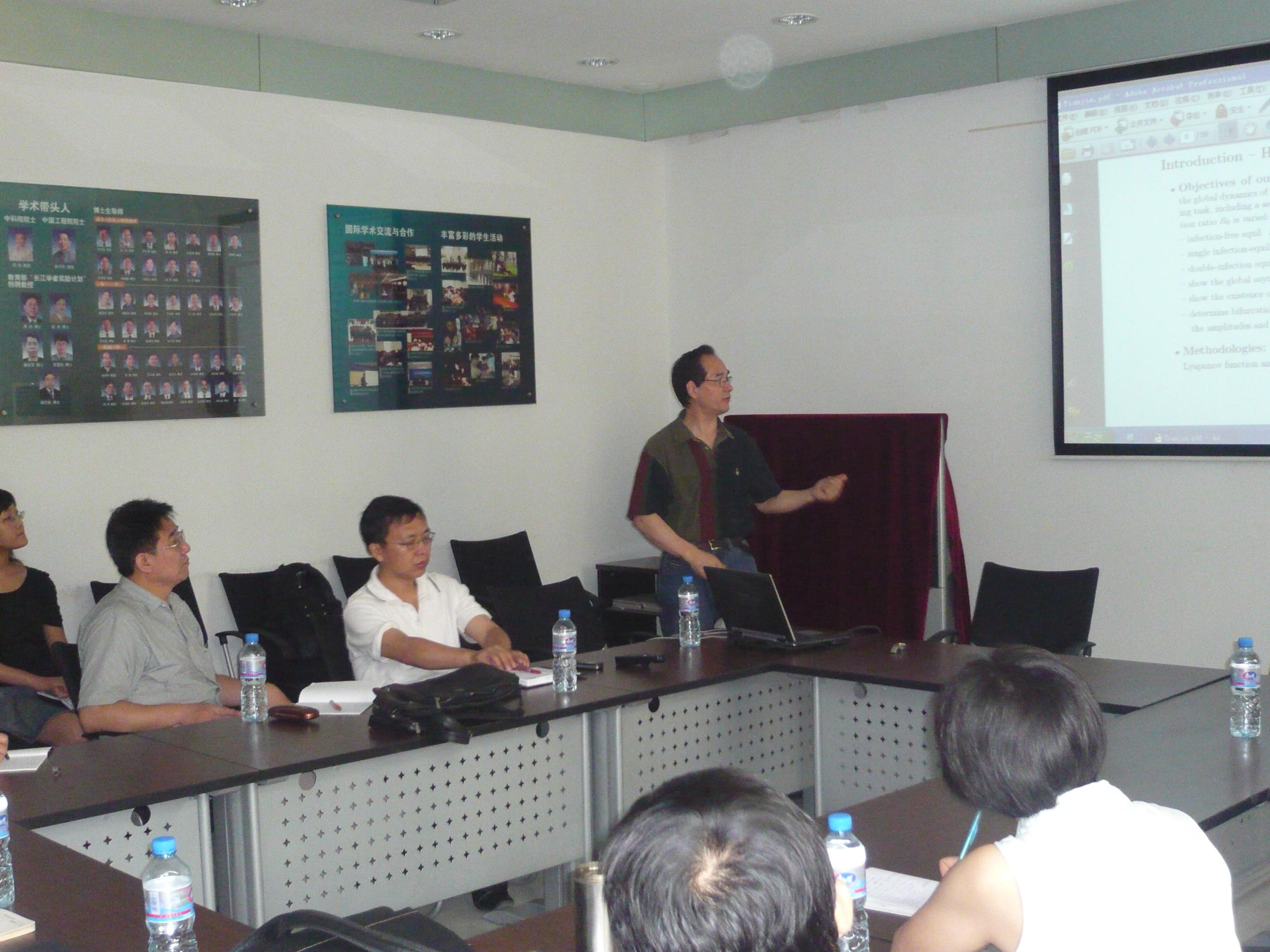 2008年7月11日,Pei Yu教授做了题为Bifurcation And Stability Analysis on a HIV-1 Therapy Model的学术报告,介绍了5维HIV-1治疗模型的平衡点稳定性和Hopf分岔,其中关于该模型Hopf分岔的理论分析是最新研究成果。会后,Pei Yu教授回答了与会师生的提问,并开展了热烈的讨论。