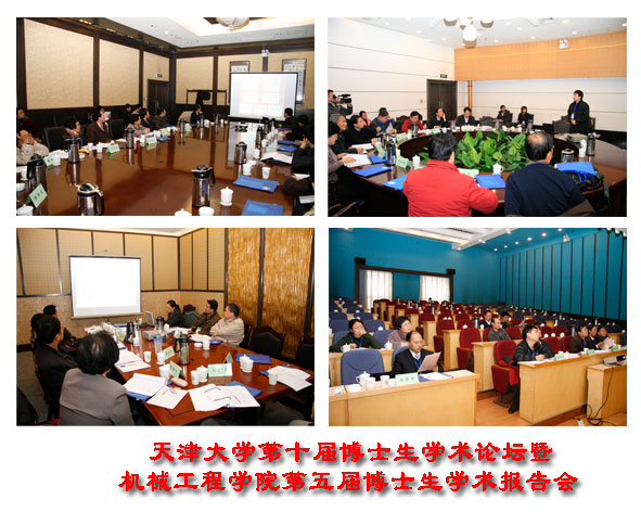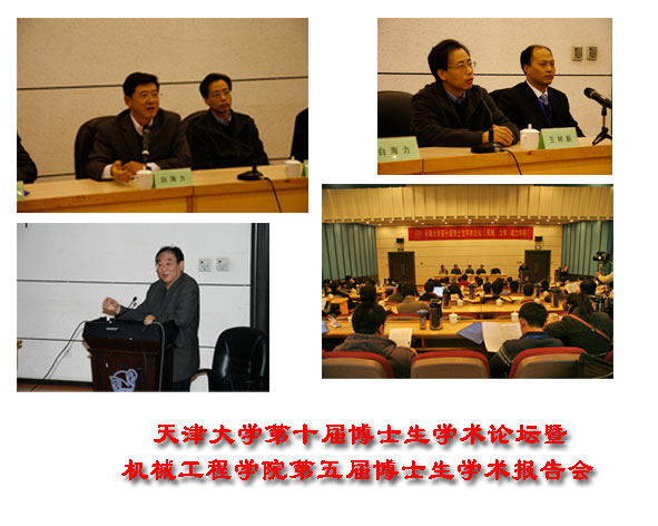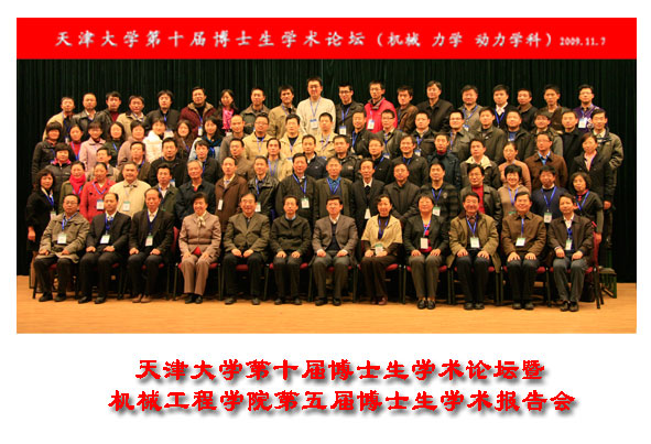2009年11月7日,“天津大学第十届博士生学术论坛暨机械工程学院第五届博士生学术报告会”于武清天鹅湖温泉度假村议事堂隆重召开。研究生院常务副院长白海力、机械工程学院院长王树新出席开幕式并讲话。国家973计划项目首席科学家苏万华,校保密办主任孙月海,机械工程学院党委书记亢一澜、副书记汪菲、副院长尧命发、副院长陈金龙,以及机械工程、力学、动力工程及工程热物理学科2007级博士生及部分指导教师近90人参加了开幕式。开幕式由机械工程学院副院长宋轶民主持。