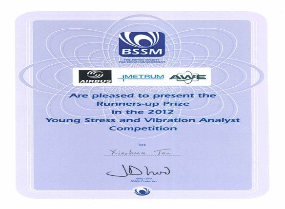 近日,《Young Stress and Vibration Analyst Competition 2012 世界青年应力与振动分析竞赛》在英国格拉斯哥大学落下帷幕,该竞赛面向世界各国学生和青年学者,天津大学机械工程学院固体力学专业研究生谭晓华成功入围决赛,并取得了第三名的优秀成绩,这是历届竞赛中,第一次有中国学生进入决赛并获奖,谭晓华此次参赛获奖展现了我校研究生学术水平和风采,体现了机械工程学院研究生人才培养质量。