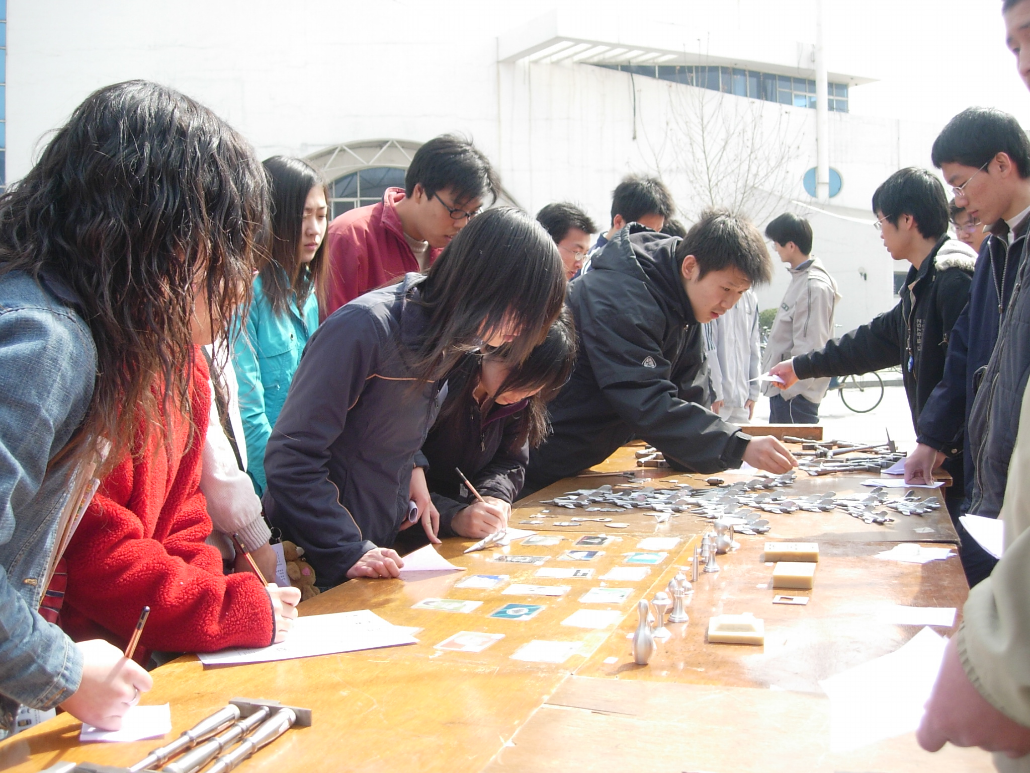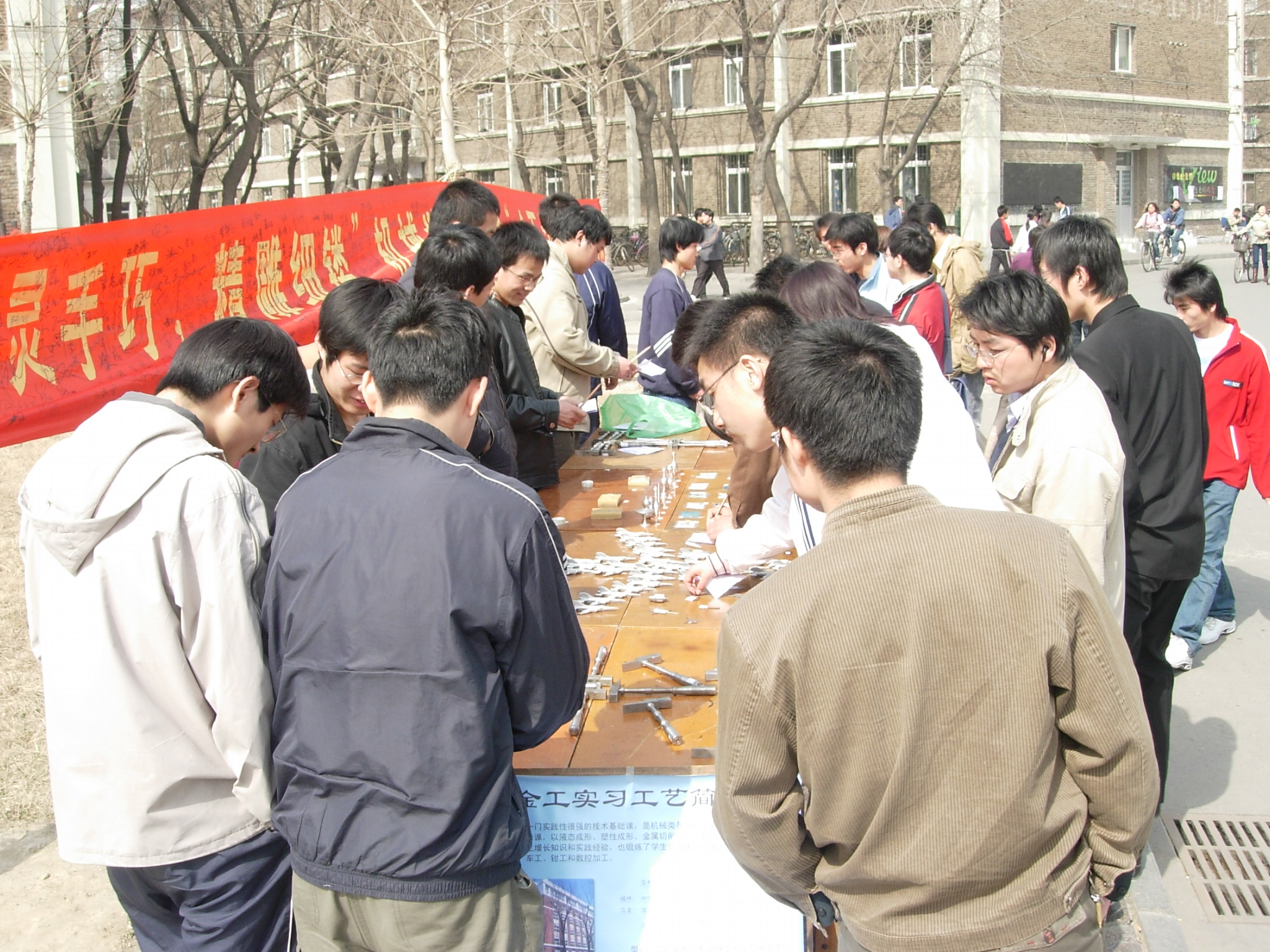 机械学院于三月十八号在北洋广场,三月十九号在学一食堂前进行金工实习作品展。本活动的主题是宣传机械学院学生会,以提高机械学院学生会在同学中的影响力和展示机械学院同学们的学习成果,愉悦大学的学习气氛,对大家的紧张学习添加调节作用!本次活动包括:对机械学院学生会“金石为开”金工实习展的横幅签名活动,对金工作品的观赏评价活动,评价的签名及选举和抽奖活动,最后是对优秀展品的颁奖和幸运观众的颁奖活动,及奖品的颁发和活动后的宣传活动,打出的是机械学院学生会的横幅,及借出了实习中心的作品进行展出。