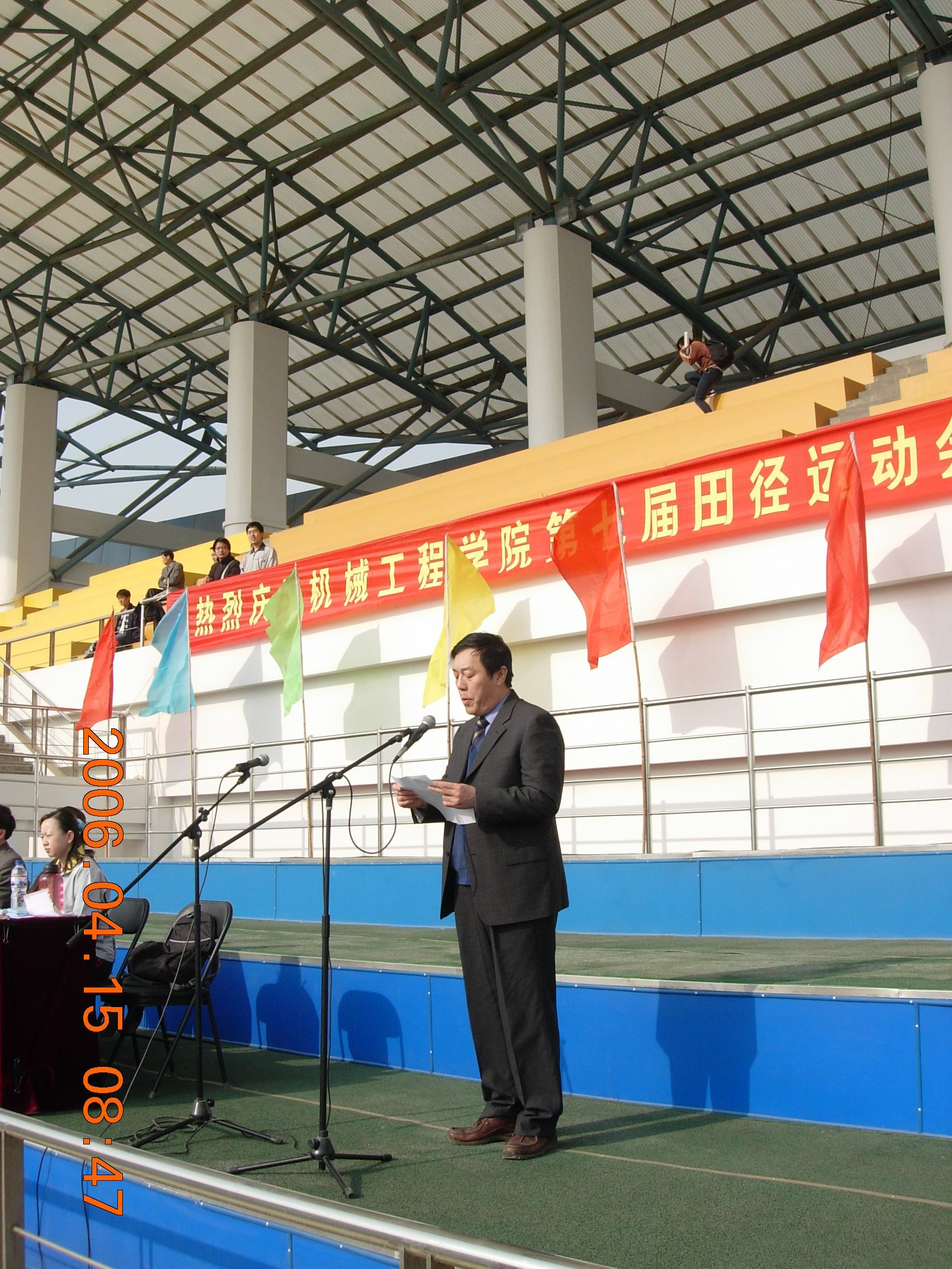 2006年4月15日上午8点,机械工程学院第七届田径运动会在天津大学体育场正式召开。运动会在简短而热烈的开幕式中拉开帷幕,全院各年级同学都参加了比赛。运动会本着“友谊第一,比赛第二”的原则,激励同学们充分展示自己的体育才能和昂扬的精神风貌,奋勇拼搏,勇夺第一。 比赛设置了100米、400米、800米,1500米,接力,铅球、跳高、跳远、趣味运动等多个项目,在老师和同学们的共同组织和参与下,运动会进行得有条不紊,激烈而带有激情,充分展现了师生间的互动和交流,欢快的笑声和热烈的加油声回荡在体育场上空。田径赛场上的气氛更为热烈,运动员们都争先恐后的在拼命奔跑,啦啦队员们呐喊助威之声激荡在整个赛场,将整个运动会推向了高潮。
