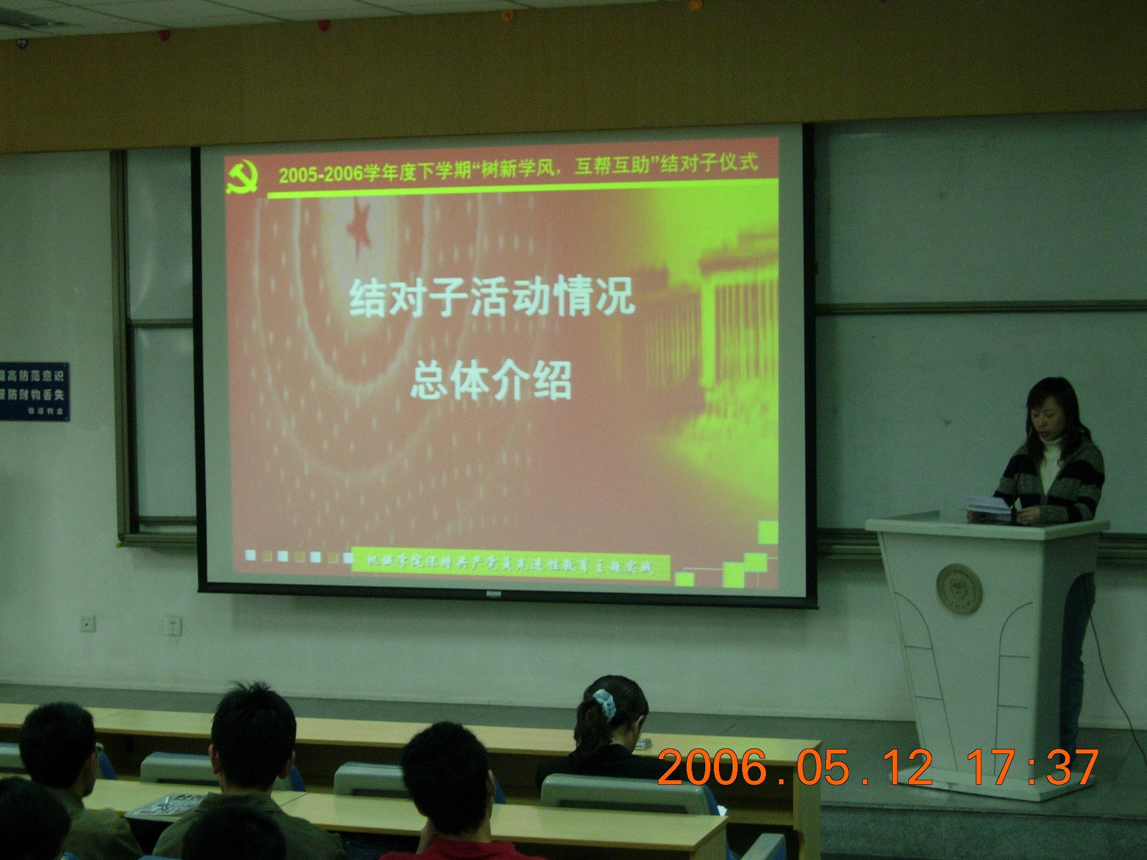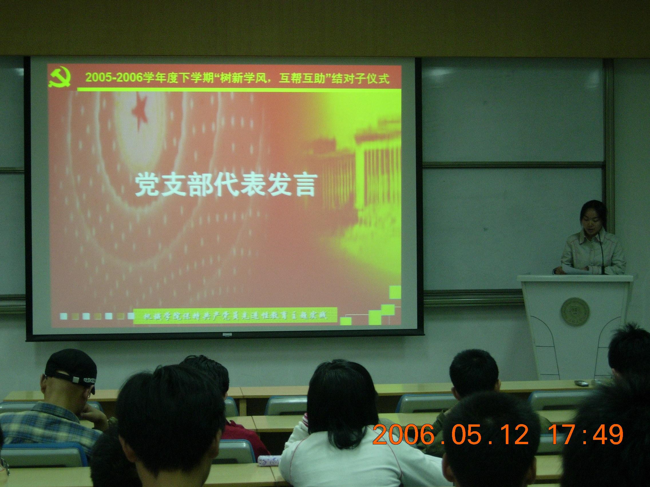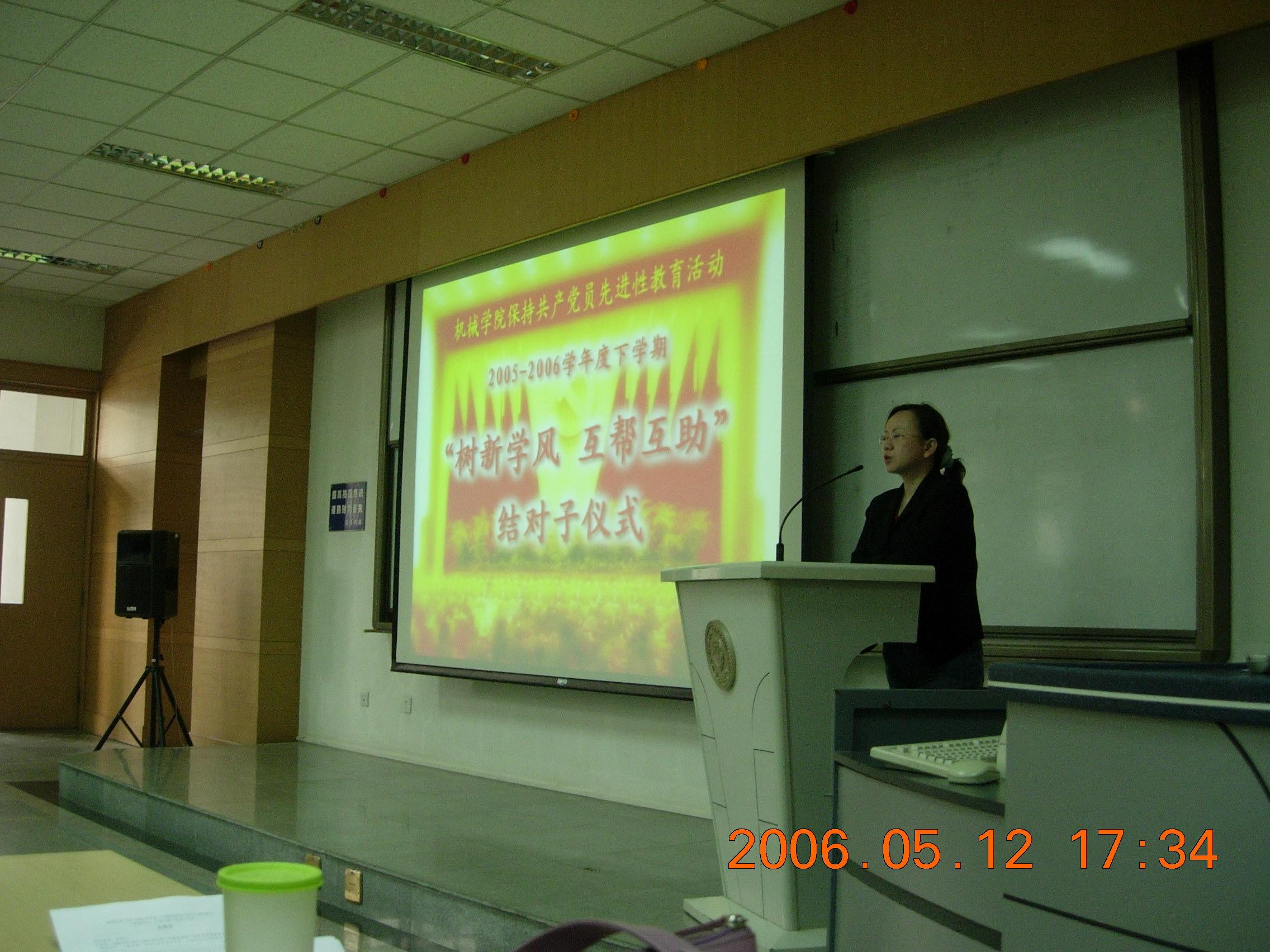 2006年5月12日下午5点,机械学院学生党总支在23-108举行“机械学院2005-2006学年度下学期保持共产党员先进性教育主题实践‘树新学风,互帮互助’结对子仪式”,机械学院新结成的61个对子和第一批结对子代表参加了仪式,机械学院学生党总支书记汪菲老师,学生党总支副书记吕静老师,学生党总支委员赵剑老师,机械学院团委焦永哲老师出席了仪式。