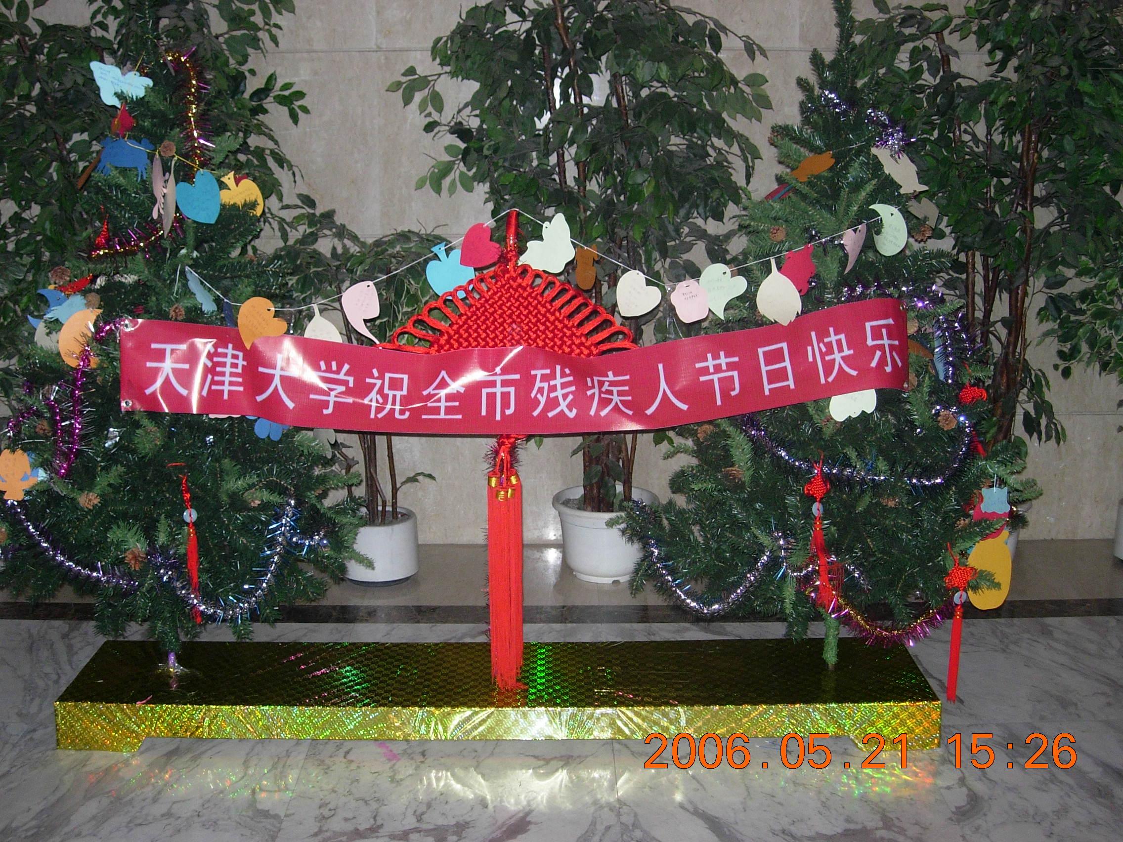 5月21日,天津市庆祝第十六次全国助残日文艺演出在天津市大剧院中剧场隆重上演,入场的每一名观众都被会场门口的两棵挂满中国结和小卡片的祝愿树深深吸引了。这就是天大机械学院的志愿者们在助残日里送给残疾人们的一份礼物,一个中国结就是一张笑脸,而一张卡片就是一个祝愿,彩线串起了祝福,也串起了天大学子对残疾人的爱和关怀。舞台上志愿者们跑前跑后搬抬道具,搀扶演员,舞台后志愿者们清理杂务,陪残疾人聊天说话。从清晨到黄昏,统一的明黄色T恤衫成了演出现场的又一道亮丽的风景线。