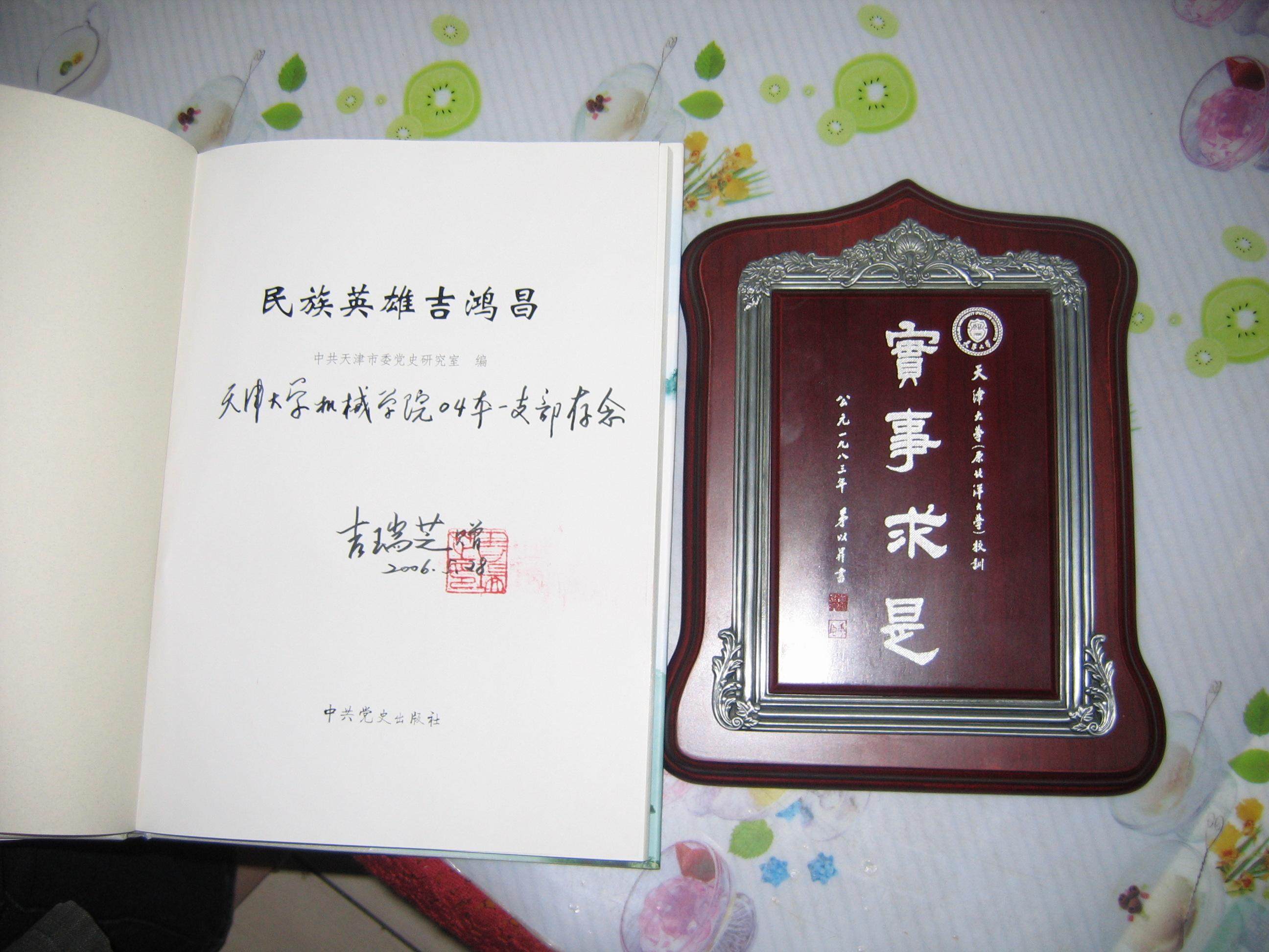 吉奶奶热情地接待了他们,并讲述了抗日名将吉鸿昌从一个旧式军人转变为一名共产主义战士,并为革命理想奋斗献身的故事。下午三点,吉奶奶和丈夫郑慈云爷爷亲切地与学生党员交谈,客厅的墙上挂满了邓小平、江泽民、李鹏、李瑞环等亲笔为吉鸿昌烈士题的词,当看到墙上吉鸿昌将军威武的画像以及其所题的“国魂”二字时,在场学生不禁肃然起敬。接着双方互赠了礼物,吉奶奶送给一本珍贵的吉将军的纪念册。学生党员们也送了一个刻着天大校训“实事求是”的纪念品。