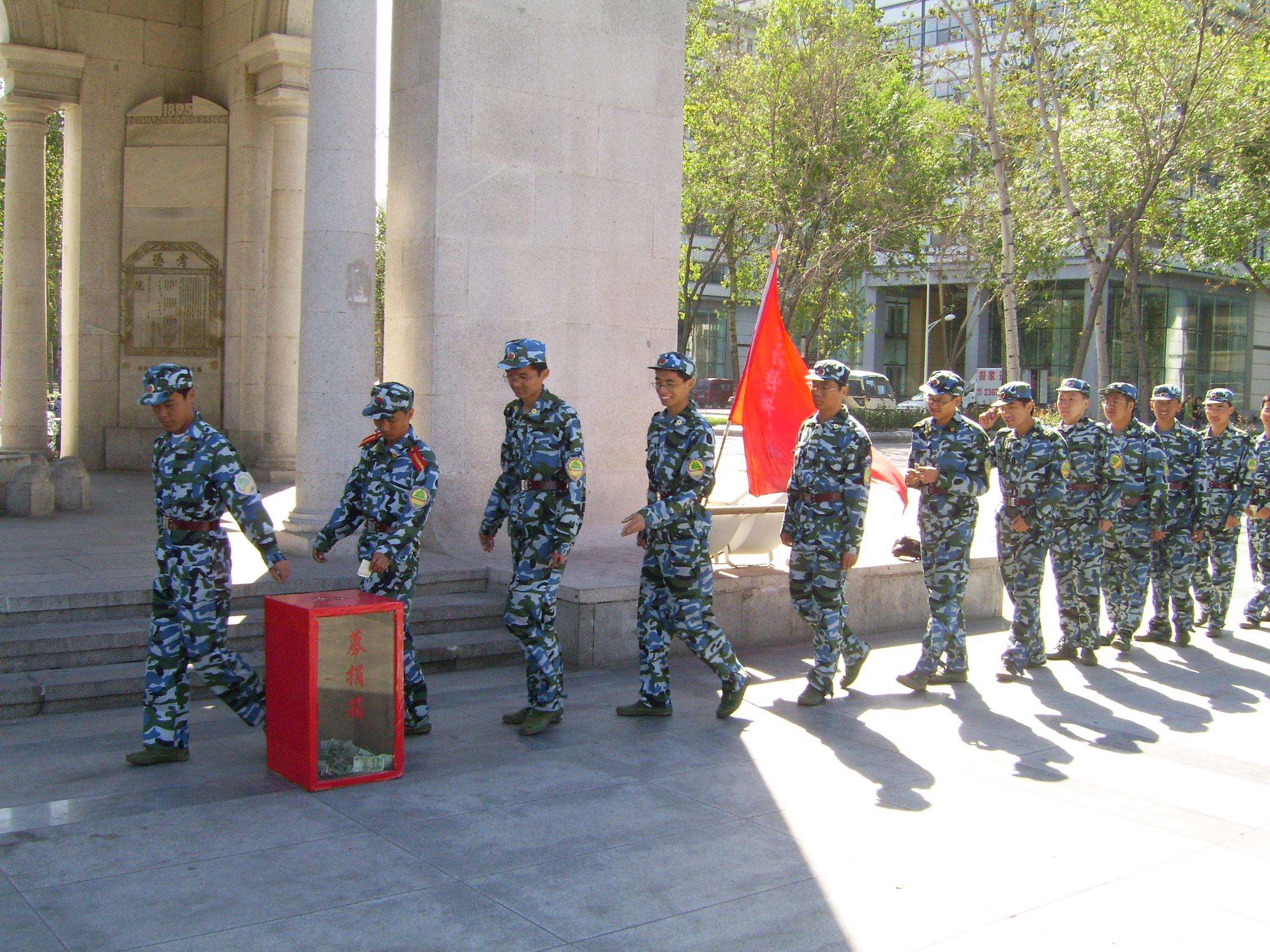 9月9日上午9点30分,在北洋大学堂前,参加军训的机械学子们响应武装部、学生军训团的号召,为黄崖关小学的贫困学生举行了一个小型的募捐仪式。武装部部长张宝帆老师亲临现场并发表讲话。天津大学学生军训团一营一、二连全体承训官兵们也积极主动的加入到了捐款活动中。