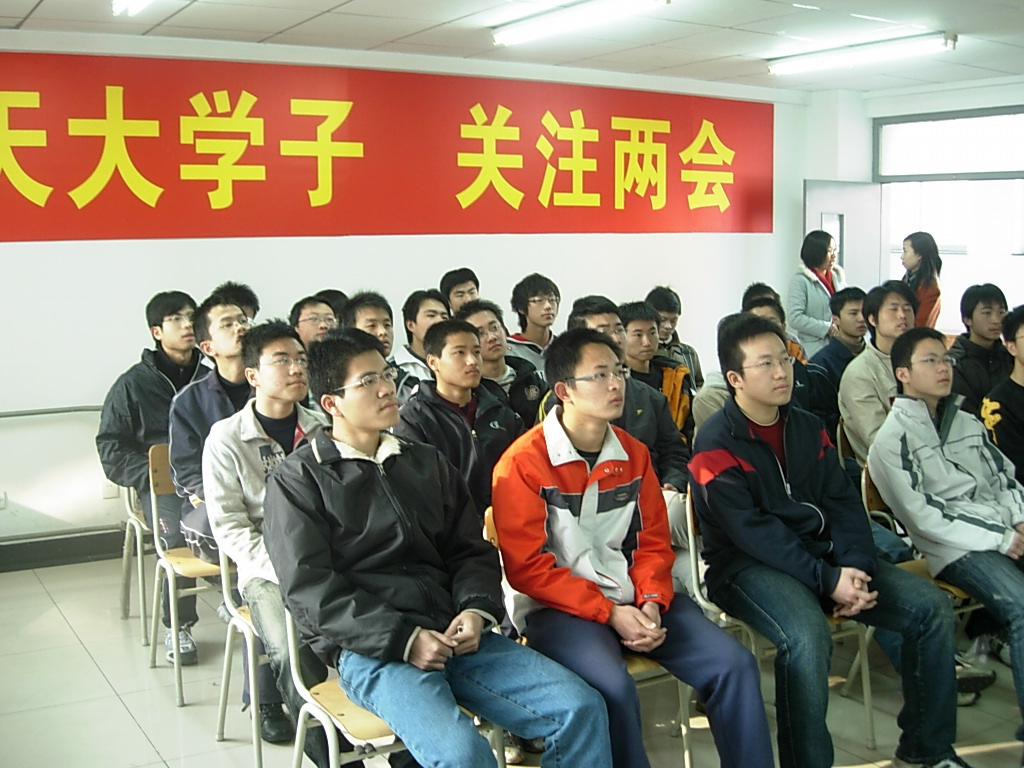 2008年3月5日,天津大学机械学院组织部分同学收看了第十一届全国人大一次会议开幕式。全程收看并聆听了温总理的政府工作报告,同学们对政府过去五年取得的成就表示认同和关注,并为祖国持续多年的高速发展感到鼓舞和振奋。会后,采访了多位同学,同学们清楚地认识到当前中国在规划下一阶段社会经济改革方面面对诸多挑战,以及十一届全国人大一次会议和全国政协十一届一次会议召开的重大意义,并对政府在台湾问题、雪灾问题、以及切身的教育问题和铁路问题上的态度表示关心。课下,同学们还有效使用报纸、互联网等资源随时关注两会进展,并对一些社会问题提议献策,表现出作为当代优秀大学生所具备的社会责任感和主人翁意识。认真听取政府工作报告后,同学们在感到欢欣鼓舞的同时也决心,作为一名07级新生,要努力学习专业知识,并要为祖国的发展贡献出自己的一份力量。