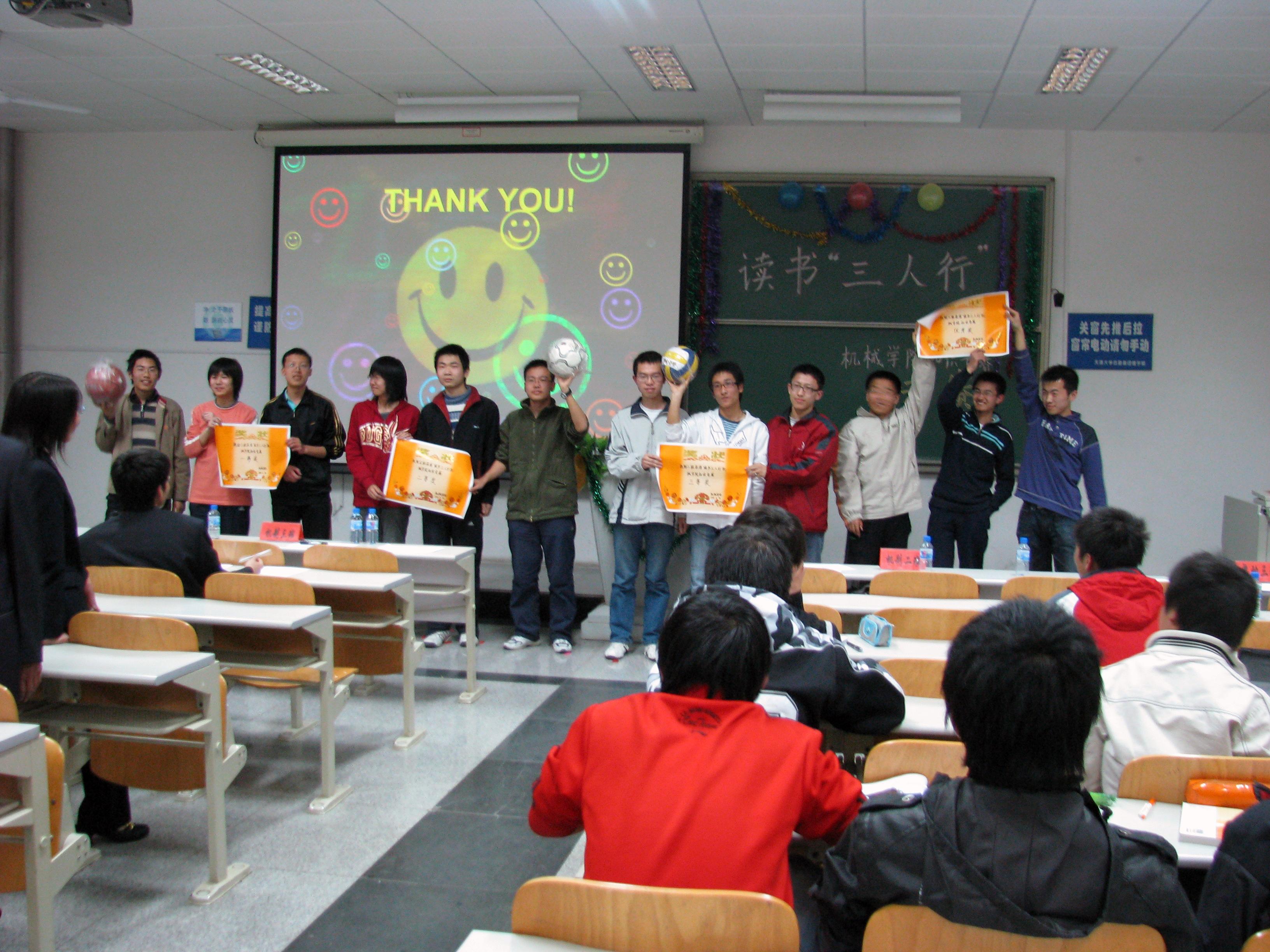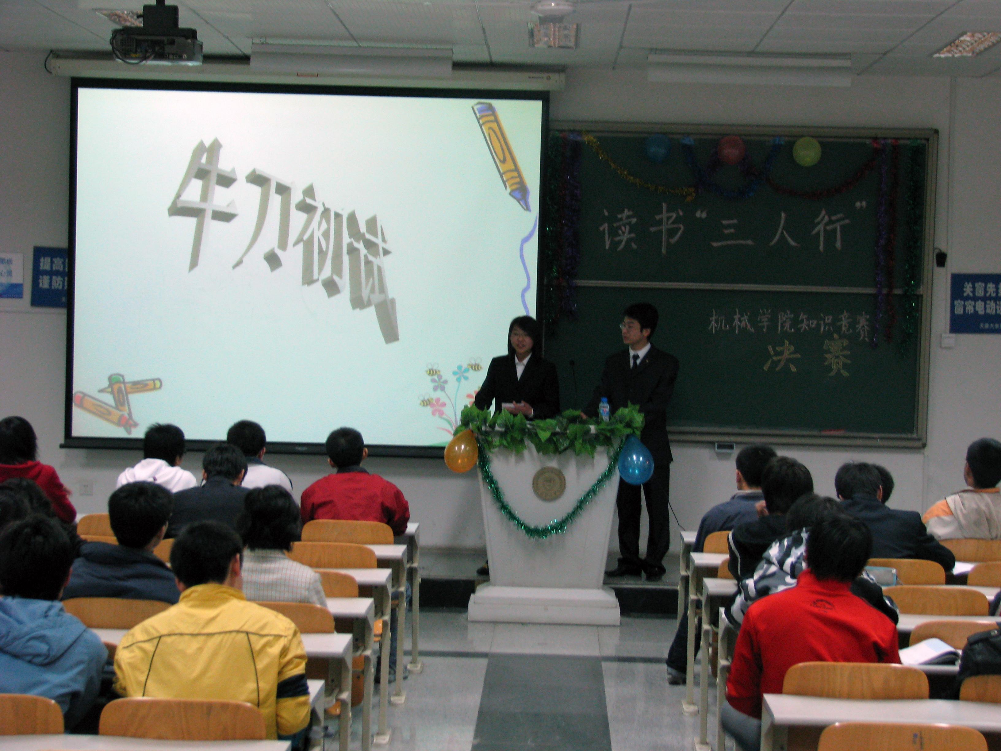 读书益智知识班级竞赛决赛于3月23号晚7:00点在24楼107进行。经过激烈的初赛对决,07级热动三班、机制二班、机制三班和机制五班顺利进入决赛。