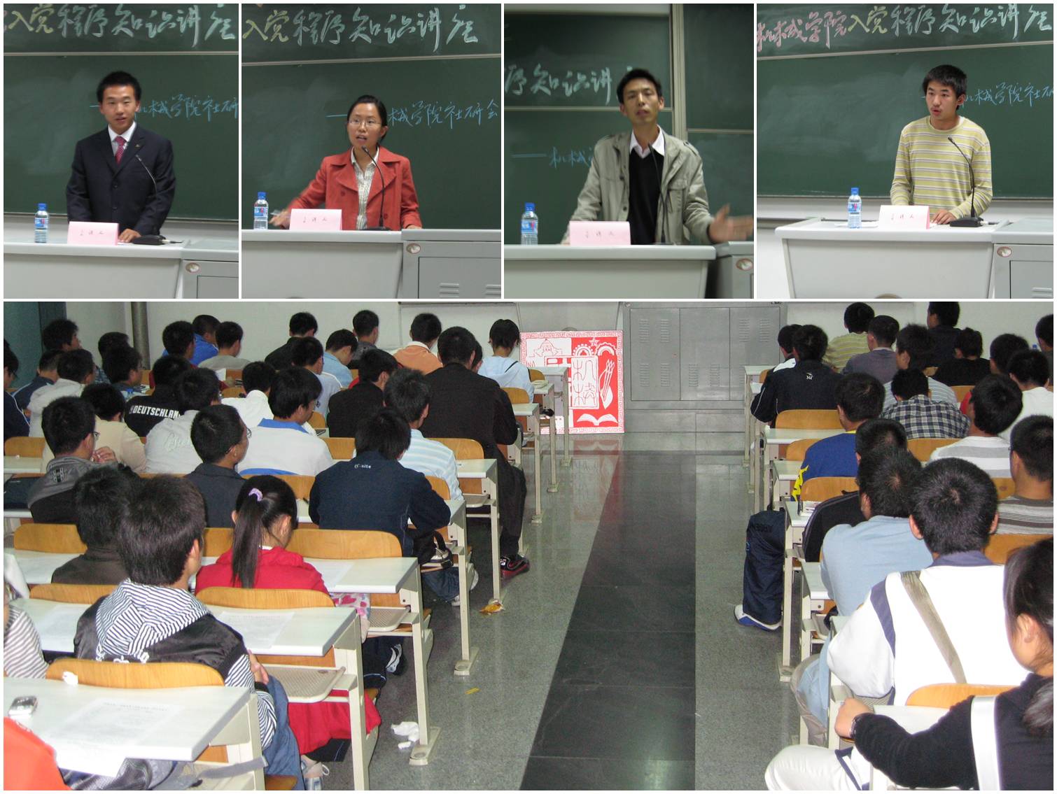 2008年10月10日晚7点,由机械学院社研会举办的新生入党知识讲座在24楼207室举行。本次活动邀请了机械学院党建指导教师刘秋菊老师以及机械学院07本党支部的党员代表禇银宇和王涛同学作为本次活动的主讲人,此外,机械学院08级辅导员杨振老师也出席了本次活动。