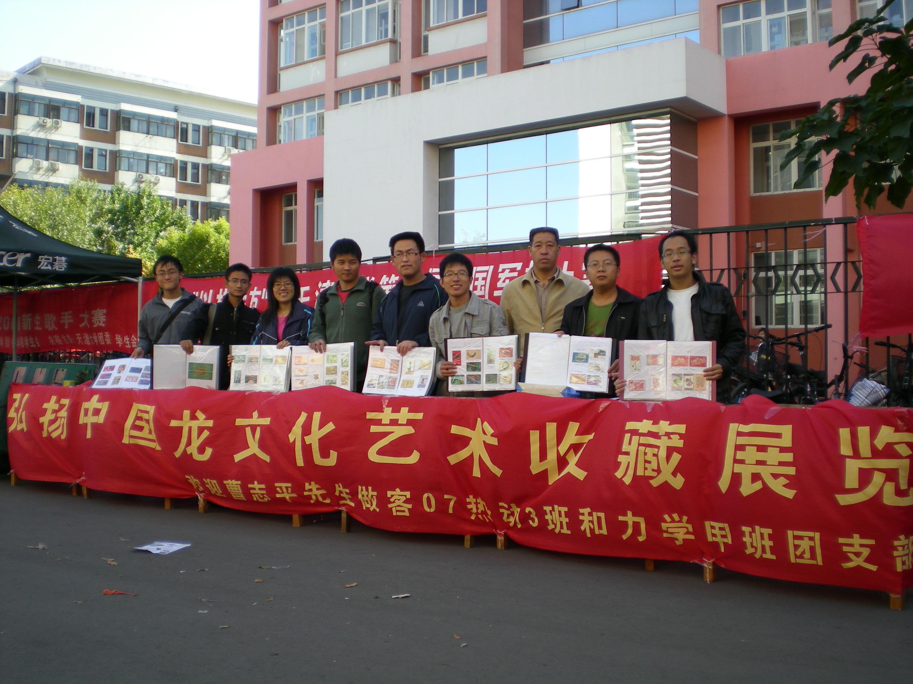 2008年10月10日中午,机械学院07级热动3班团支部和力学甲班团支部在学五前广场共同举办了“弘扬中华龙文化艺术收藏展览”。