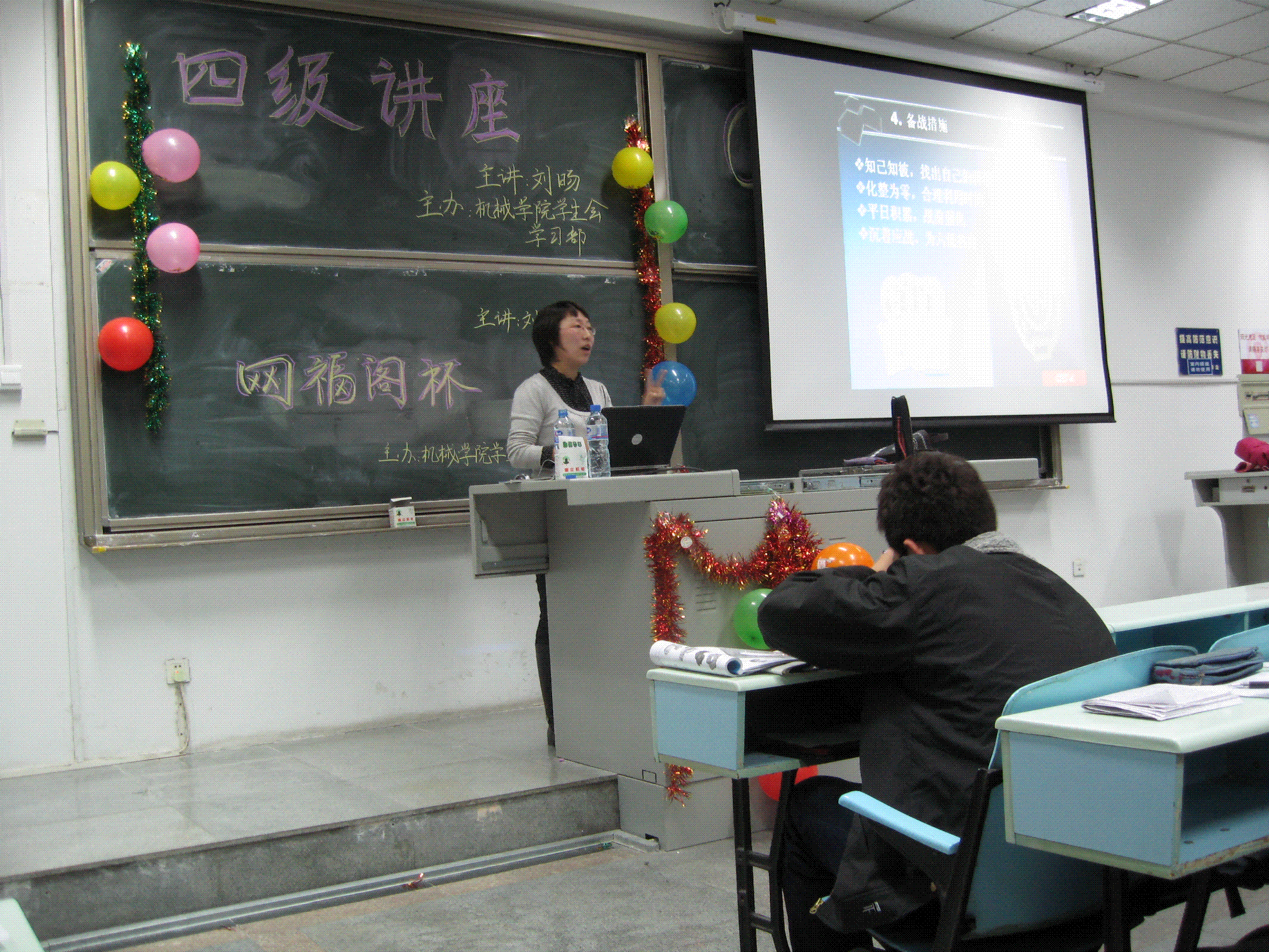 国家英语四级考试在即,对于刚刚入学的新生来说英语四级考试无疑是一个困惑。针对此情况,机械学院学生会学习部于11月16日在23号教学楼204教室举办了针对2008级新同学的英语四级讲座。