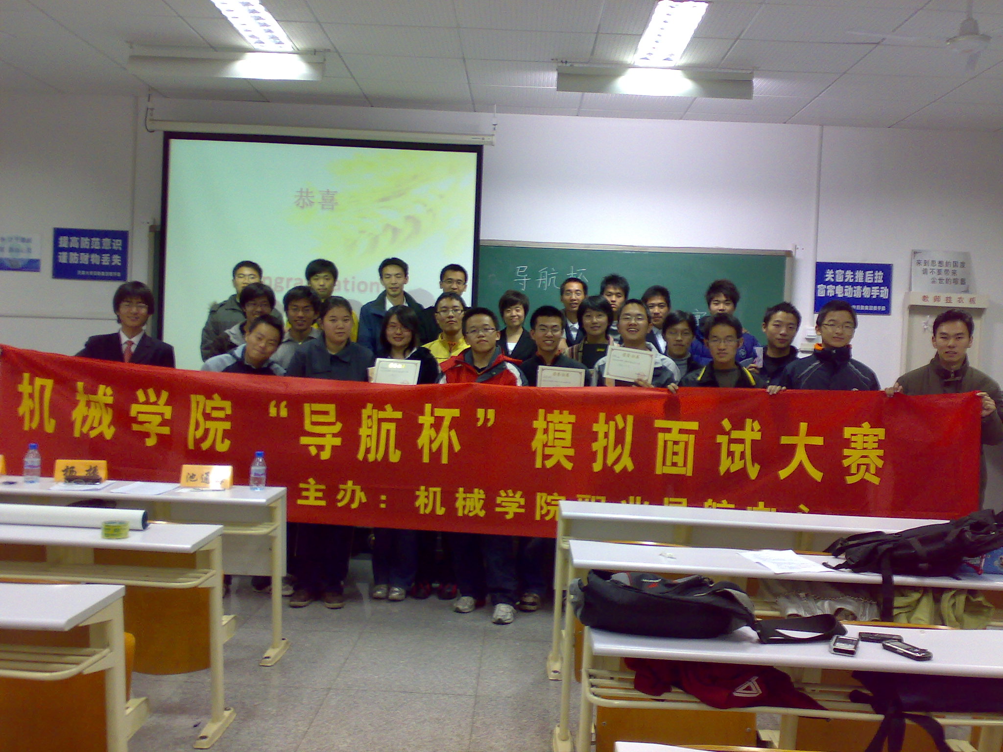2008年11月23日,机械学院首届“导航杯”模拟面试大赛成功举办,此次活动由机械学院职业导航中心策划并举办,参赛选手是经历了初赛选拔的6名机械学院大一新生,到场的嘉宾有机械学院敦立明老师、杨振老师、辅导员助理崔奎虎学长和池通海学长。
