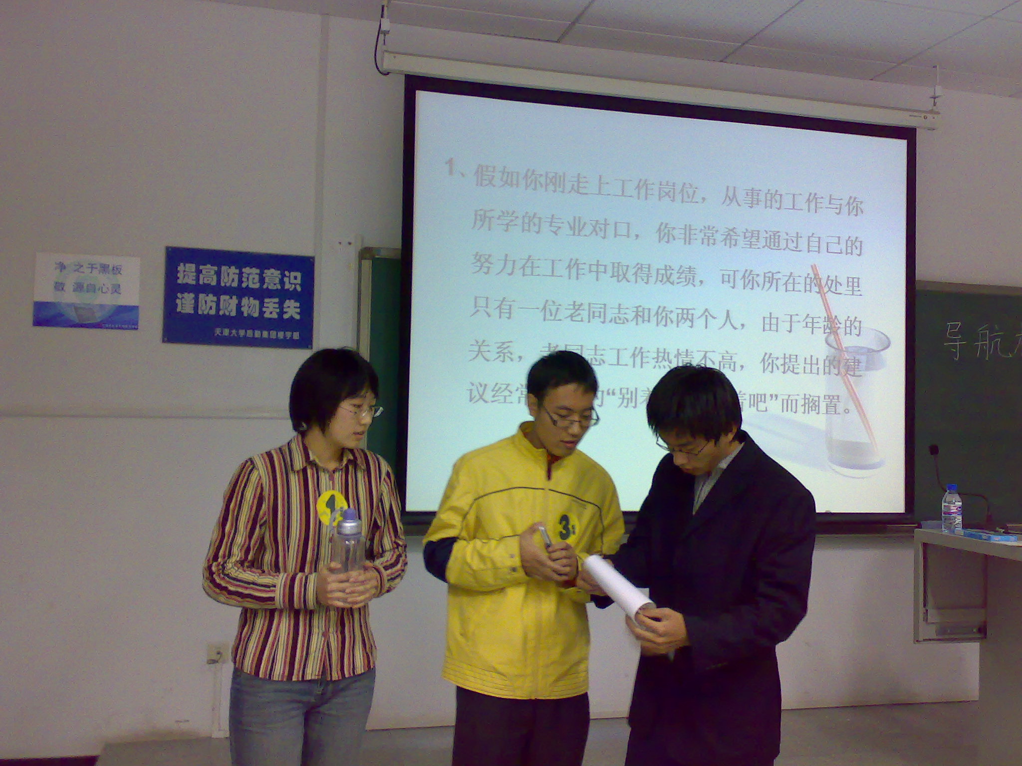 之后是职场情景模拟,要求选手们以短剧的形式再现所给的职场情景,并通过表演表达出对此问题的观点及解决办法,选手均表现出了良好的心理素质和较高的应变能力,活动受到了广泛好评,得到了到场嘉宾、选手以及观众的高度评价。