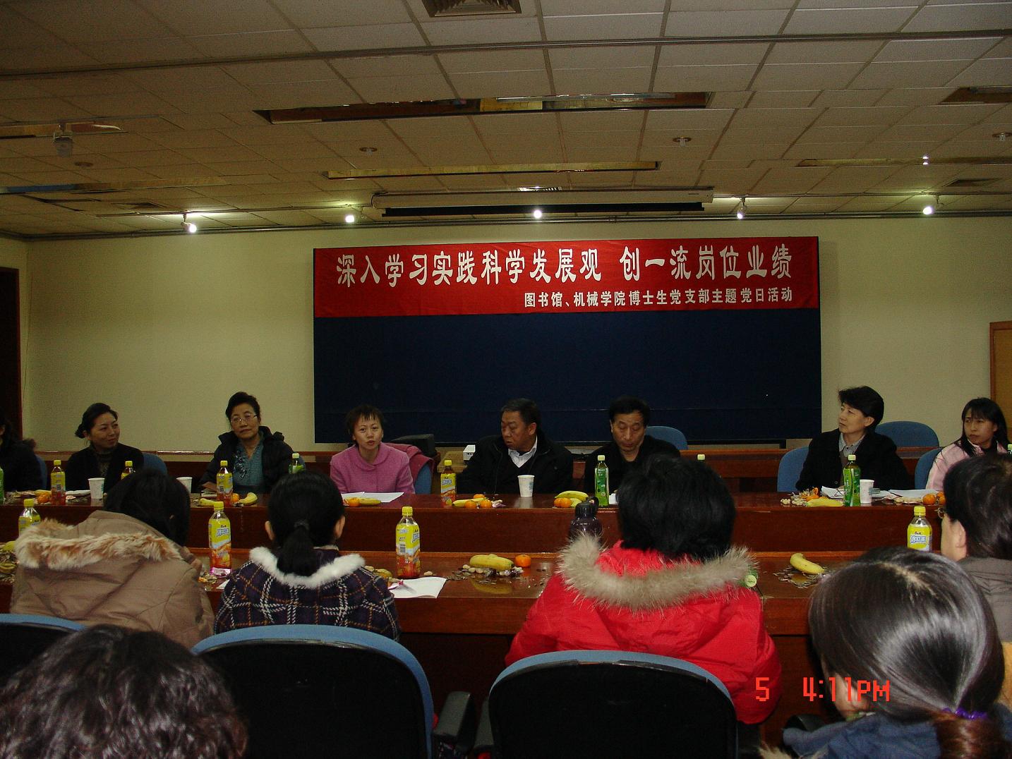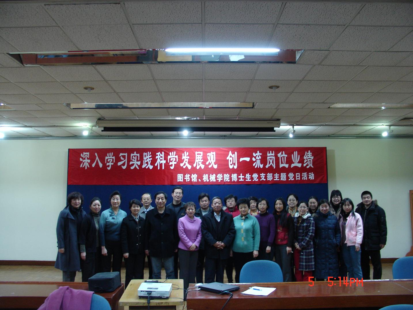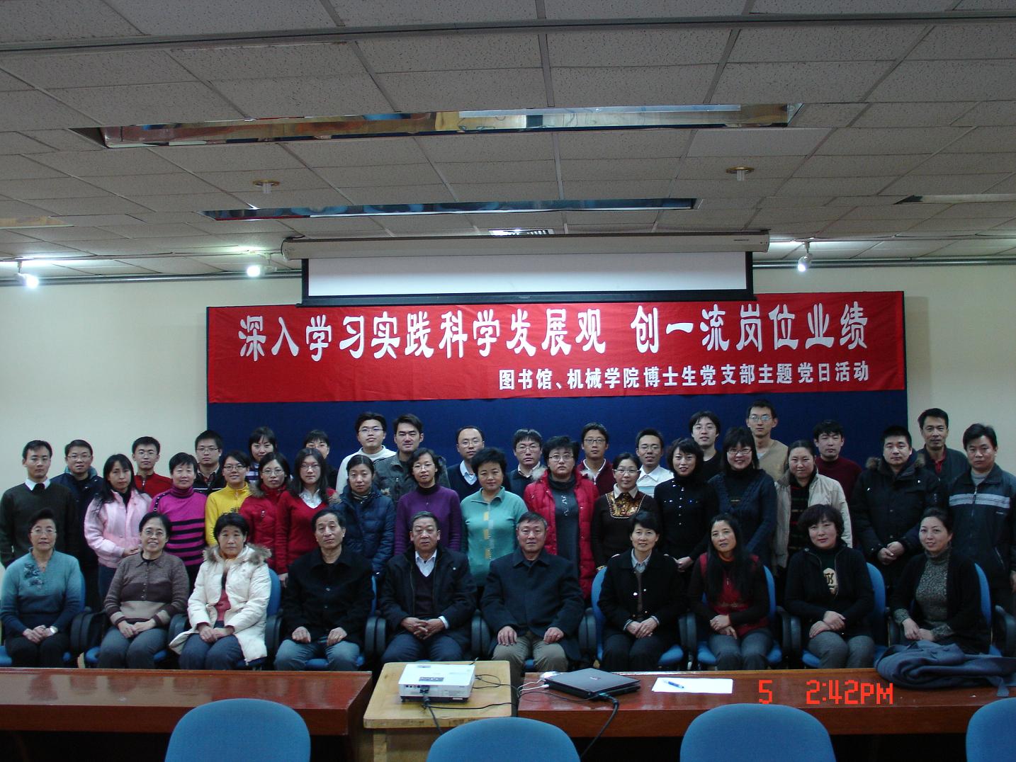 2008年12月5日,在天津大学科图一层报告厅,机械学院博士生党支部与科图党支部联合开展了主题为“深入学习科学实践发展观,创一流岗位业绩”的主题党日活动。