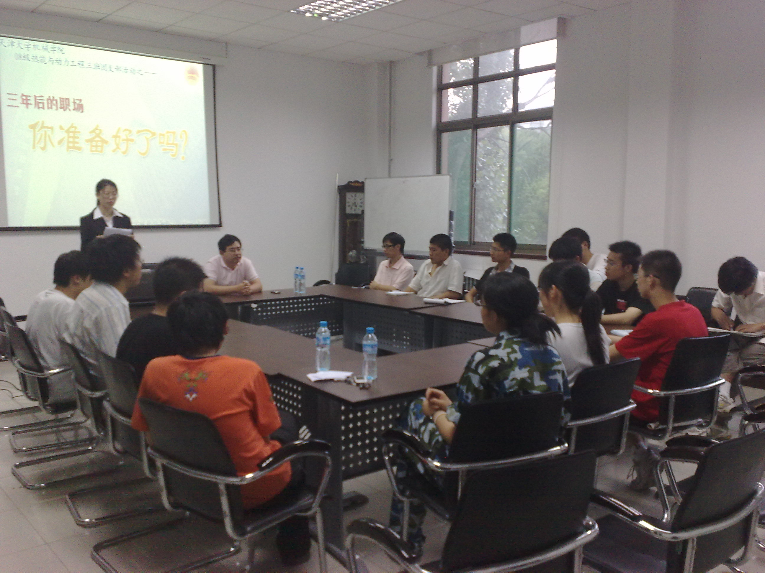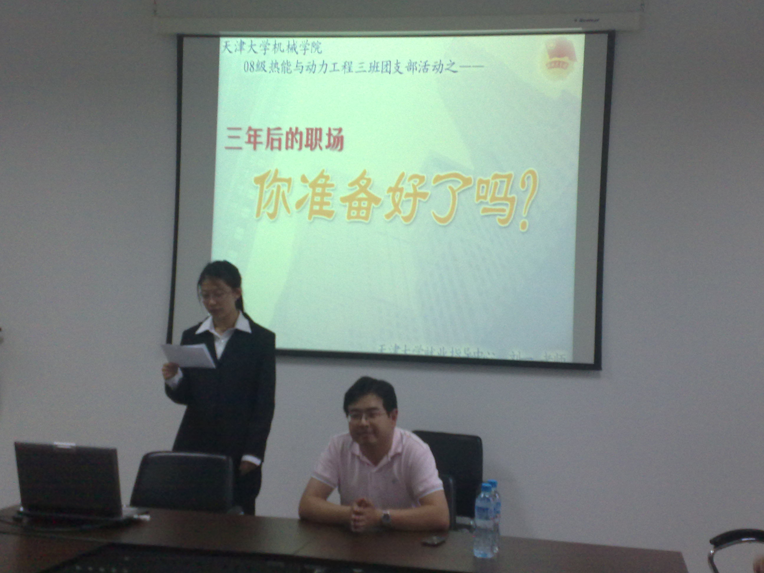 2009年5月24日晚7:00,机械学院热能与动力工程三班在机械学院三层会议室举办了主题为“三年后的职场,你准备好了吗”的职场指导讲座。天津大学就业指导中心职业指导师刘一老师抛弃了刻板枯燥的理论,用生动幽默的实例,针对2008级本科生面对金融危机下对就业形势的担忧,总结了我们面对职场需要做准备的几点精华内容。