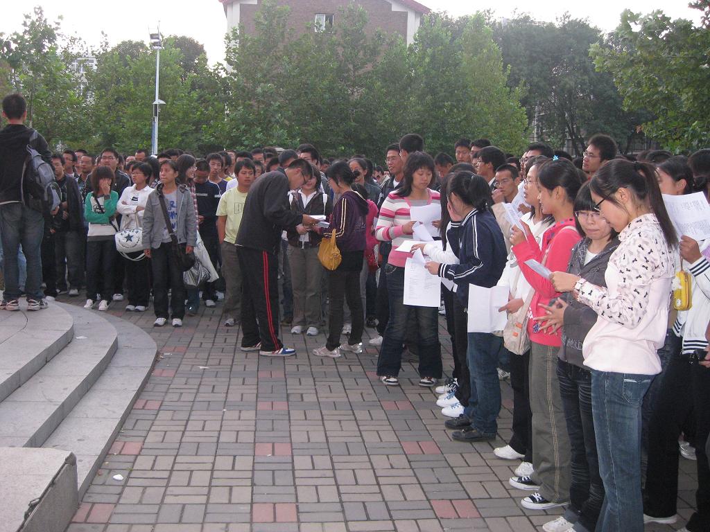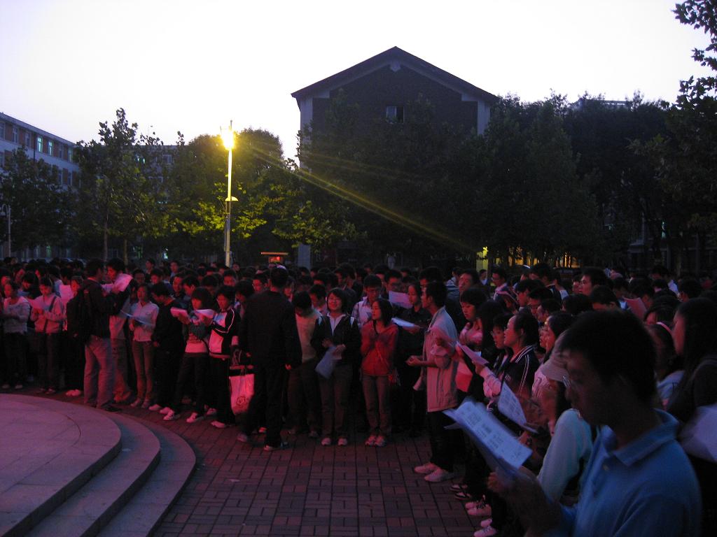 晚六点,天津大学机械学院08级、09级全体本科及09级研究生900余人于大学生活动中心门前汇聚一堂,共同为《天津大学庆祝新中国成立60周年万人歌会》活动进行彩排练习。