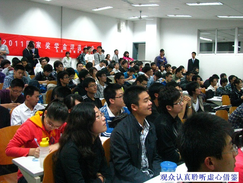 10月12日晚7点,机械学院国家奖学金评审大会在24教学楼207室拉开帷幕,出席本次评审大会并担任评委的有机械学院党委副书记杨志永老师、学工部韩远彬老师及各年级辅导员老师;为增加评比的公平性和参与性,机械学院学生会还邀请了优秀研究生学长、学姐作为评委会成员;现场全体观众也参与其中,他们手中神圣的一票,也占据最终成绩的50%;到会学习的同学逾200余人,现场“站无虚席”,大会获得圆满成功!