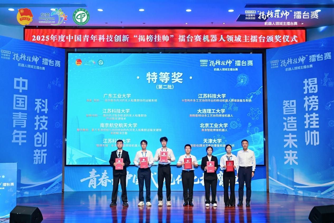 其中,机器人领域主擂台赛聚焦智能感知、自主控制、人机协同等核心技术方向,以激发青年创新潜能,攻克“卡脖子”技术,深化产学研深度融合,加速技术落地,服务区域战略发展,赋能城市数字化转型。赛事采用现场打擂的形式,组织各榜题夺擂团队通过项目展示、问辩、点评总结、投票评分等环节评出获奖等次。来自清华大学、哈尔滨工业大学、南京大学、华南理工大学等全国67所高校的151支青年科创团队报名参赛,最终96支团队进入终审决赛,我院队伍最终斩获特等奖。