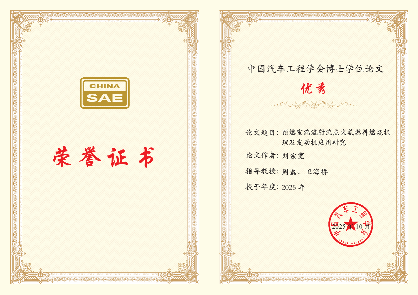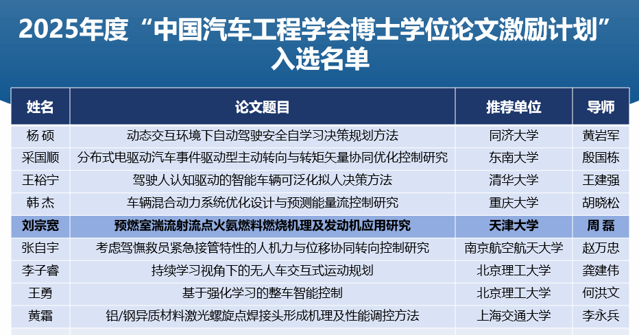 中国汽车工程学会博士学位论文激励计划旨在激励博士研究生潜心钻研、勇于创新,产出具有重要学术价值和应用前景的优秀博士学位论文,推动中国汽车科技水平的进步。该计划每年评选一次,入选者均为全国各高校在车辆工程及相关领域做出突出创新成果的顶尖博士毕业生,其评选结果备受学术界与产业界关注。此次全国共征集到214篇论文,经过函评、会评、终评答辩3个环节,最终共有9篇论文正式入选。刘宗宽博士为内燃机领域唯一入选者。