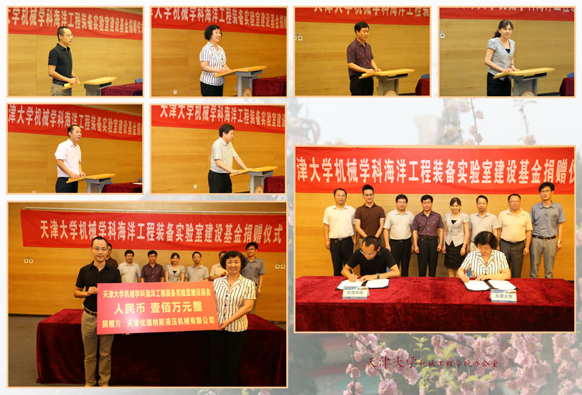 为促进天津大学机械学科海洋工程装备实验室的发展与建设,加强产学研合作,全面提升天津大学机械学科核心竞争力,构建产学研交流创新平台,天津优瑞纳斯液压机械有限公司与天津大学双方经友好协商,天津优瑞纳斯液压机械有限公司决定捐资设立“天津大学机械学科海洋工程装备实验室建设基金”,并捐资100万元用于支持天津大学机械学科海洋工程装备实验室建设及学科发展。