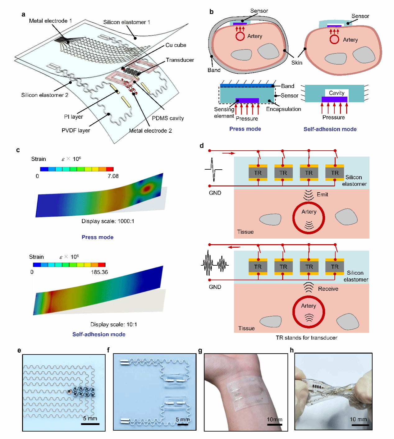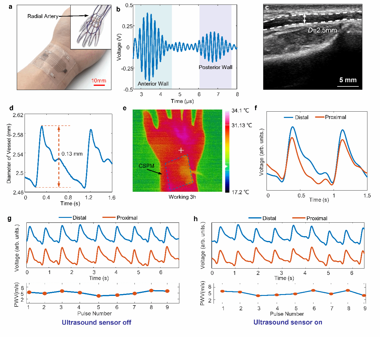 随着可穿戴医疗技术的快速发展,无袖带血压监测因非侵入性、连续性优势,成为高血压早期筛查和个性化医疗的关键技术手段。然而,现有设备普遍存在两大核心痛点:长期使用需频繁校准才能保证准确性,且难以适配不同性别、年龄、肤色人群的血管生理差异,严重限制了其临床应用与普及。针对上述难题,研究团队创新性地提出器件设计+算法优化的一体化解决方案,研发出保形可拉伸压电微系统(CSPM)。该系统集成了两种核心传感模块:基于空腔增强型压电薄膜的脉搏波形传感器,灵敏度较传统设计方案提升约160倍,能精准捕获脉搏波信号;2×4阵列式超声传感器,可实时测量血管直径及其动态变化,分辨率达4.928 μm。两种传感器能够在同一局部血管区域同时工作,实现脉搏波速度(PWV)与血管直径的精准同步测量,为血压计算提供了全面的血流动力学参数支撑。该微系统还具备出色的穿戴性能:整体厚度不足450 μm、重量小于1g,采用低刚度硅橡胶封装,可拉伸至40%,能紧密贴合手腕等曲面皮肤,且疏水防汗、生物相容性优异,连续工作3小时温度保持稳定,可满足长期不间断监测需求。