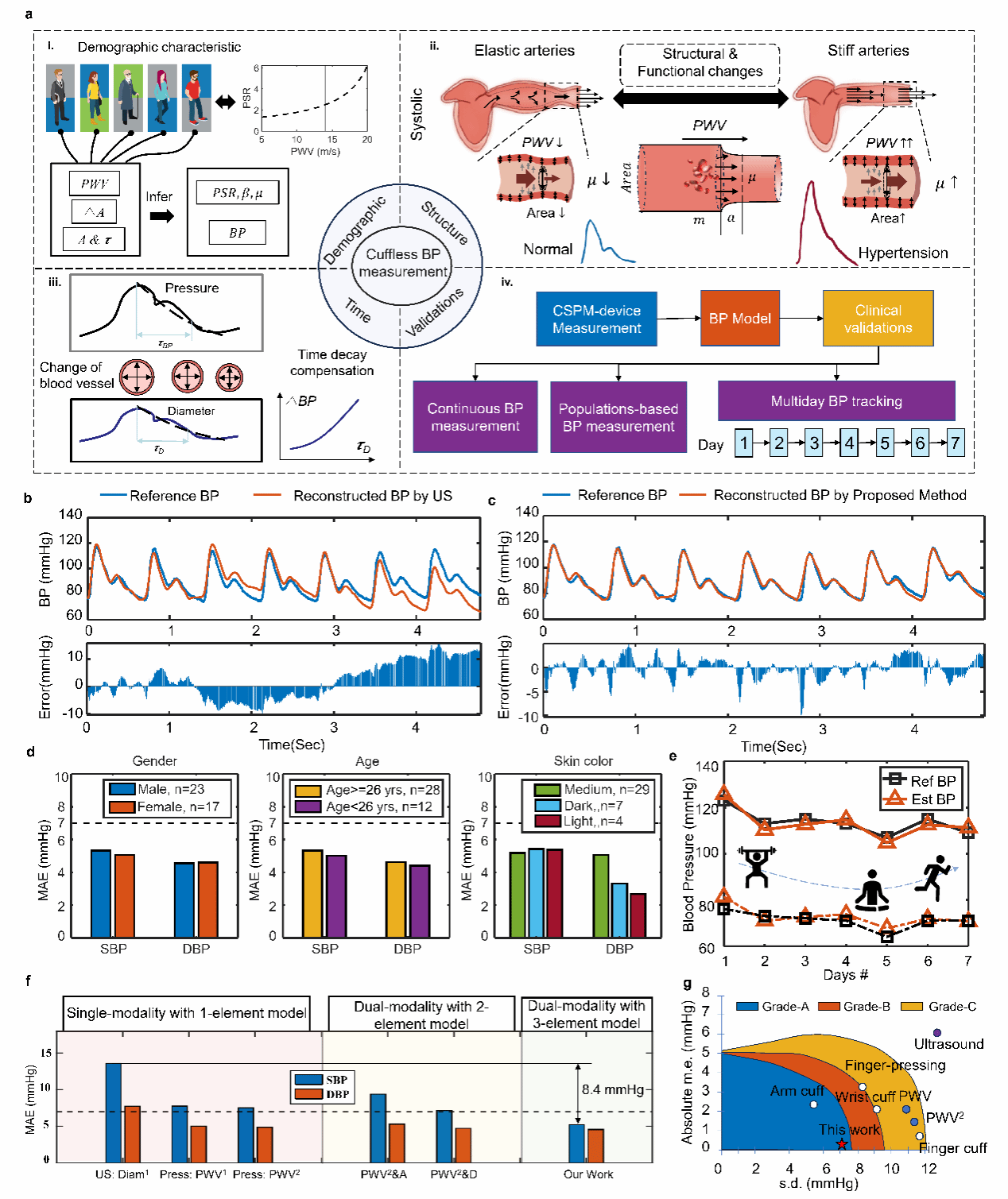在算法层面,团队构建了基于人口统计学的自适应血压模型,同时引入时间衰减补偿策略,有效解决可穿戴传感器轻微滑移导致的测量偏差,确保长期血压监测稳定性。研究团队对45名受试者开展测试,测试结果显示其在不同性别、年龄、肤色人群中均表现出稳定准确性,且能精准跟踪7天内日常活动(包括举重、跑步等)中的血压变化,另外无需个体校准即可直接使用,收缩压平均绝对误差仅5.22 mmHg,舒张压仅4.57 mmHg,精度媲美专业袖带式医疗设备。