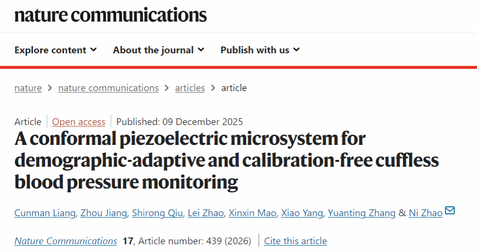 (通讯员:梁存满)近日,天津大学机械工程学院机械系梁存满副研究员与香港中文大学、香港城市大学等单位合作,在无袖带血压监测技术领域取得重大突破。相关研究成果以“A conformal piezoelectric microsystem for demographic-adaptive and calibration-free cuffless blood pressure monitoring”为题,发表于国际顶级期刊《Nature Communications》(《自然・通讯》),为长期、精准的心血管健康监测提供了全新解决方案。