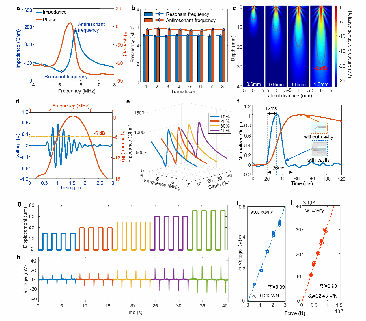 图3.共形可拉伸压电微系统性能表征